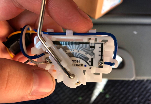 Рычажный датчик топлива состоит из поплавка, закрепленного на контакте датчика с металлическим рычагом. Он имеет сектор, разделенный на металлические полоски резистивного типа. В основе его конструкции лежат надежные износостойкие резисторы с толстой пленкой.